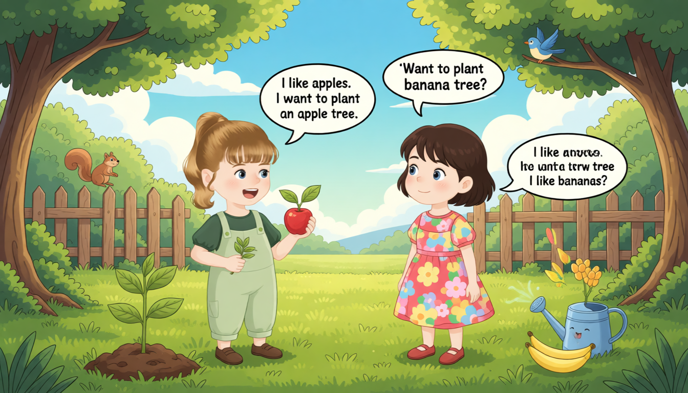 Mike says, "I like apples. I want to plant an apple tree." Everything says, "I like bananas." Want to plant banana tree?