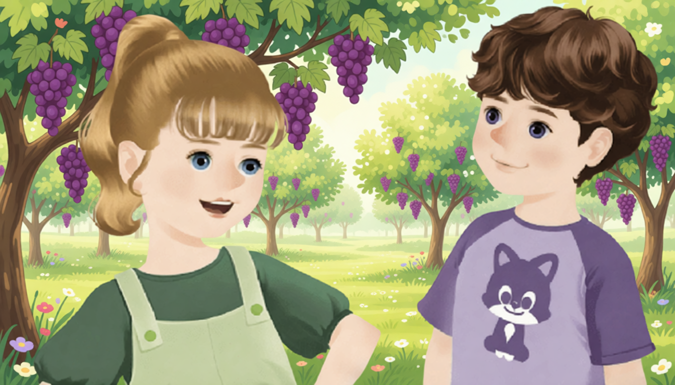Weeks later, the little trees start to grow. Mike and Sarah are all happy. Grapes are small, round and purple. They look like small bananas. The fruit are beautiful. Then Mike and Sarah eat the fruit. The fruit is yummy.