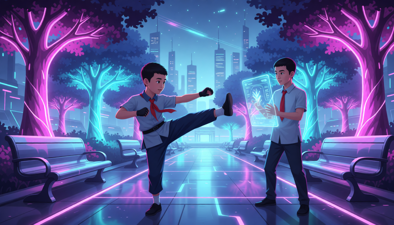 Zhang Peng is surprised. He writes back. He says, "I like singing and playing football. Do you like kung fu? That's cool! My friend Wu Binbin likes doing kung fu too." He sends a video of Wu Binbin doing kung fu in the park.