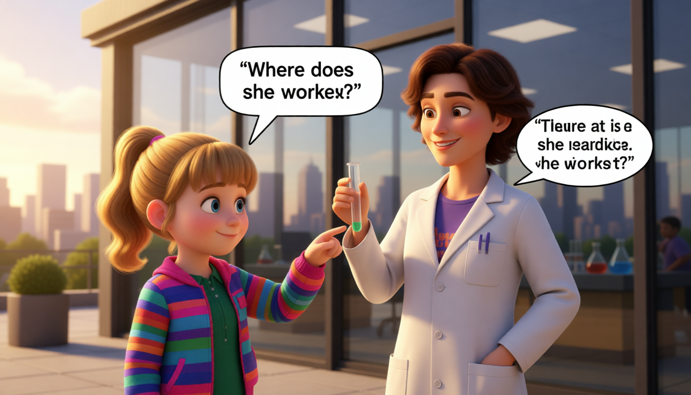 Sarah points to a woman in a lab coat and says, "She is a scientist." John asks, "Where does she work?" Sarah says, "She works at a science lab near our city."