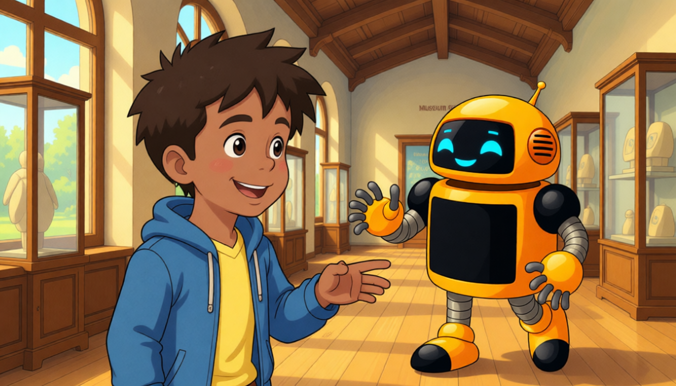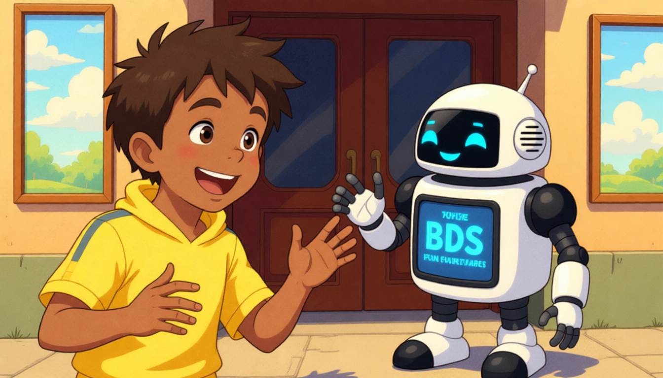 Hey, John. I have BDS. Where do you want to go? Robin asks. "I want to buy a postcard," John answers. "No problem. I can help you find the museum shop. Follow me," Robin says.