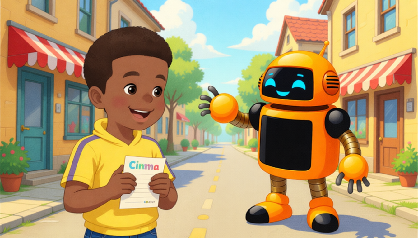 After buying the postcard, John wants to go to the cinema. Where is the cinema? Robin answers, "It's next to the bookstore." How do we get there? Robin says, "Turn left at the bookstore, then turn right at the hospital."