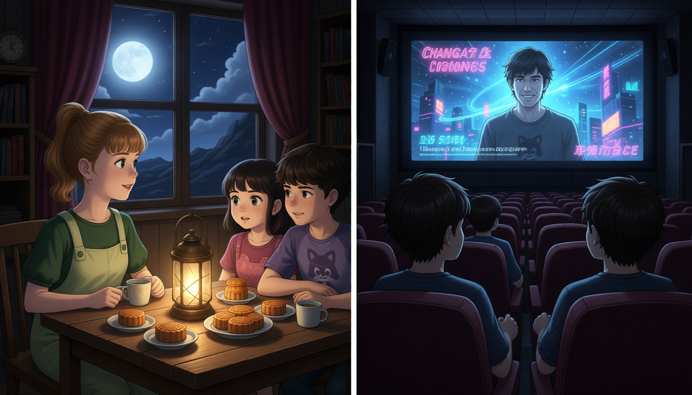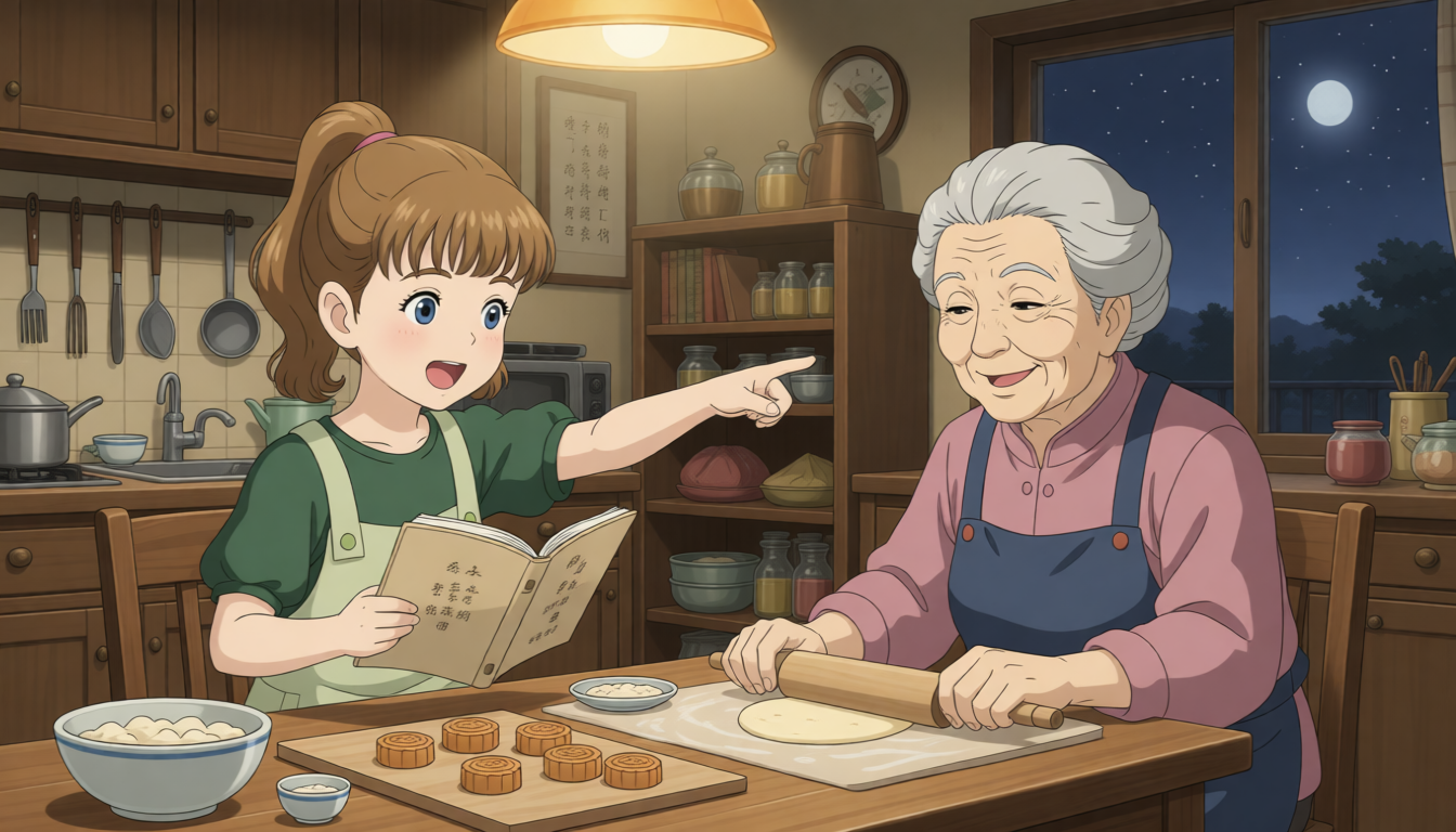 Sarah says, "Look, my aunt is going to make mooncakes." My grandma will tell us the story of Chang'e. I will read a poem about family.